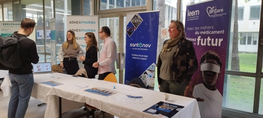 Santenov et ses entreprises (Crossject, Delpharm, Astrea Pharma, Adhex Pharma, URGO, Icta) présentes au forum ont pu parler des opportunités de carrières en industries. Elles ont pu continuer les échanges sur le stand mutualisé Santenov.