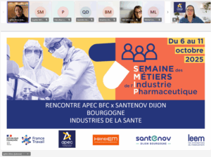 Pour débuter la semaine, plus de 90 cadres et assimilés cadres étaient présents lors d’un webinaire organisé avec l’APEC pour découvrir la filière et les métiers. Plusieurs adhérents et entreprises de la région ont eu l’occasion de présenter leur entreprises, les métiers et compétences qui en découlent et partager les offres d’emploi en cours : Delpharm, AdhexPharma, Cpage, ICTA, Sophysa et Vetoquinol.